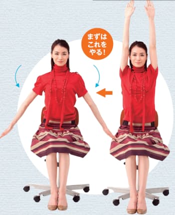座ったままで腕を真上に上げ、息を吸いながらできるだけお腹を薄くし、3秒キープ。そのまま息を吐きながらゆっくり下ろす。