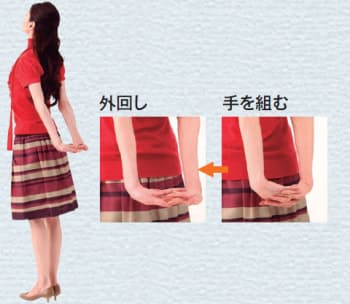 手を後ろで組み、手のひらを背中側から裏返す。このとき、肩甲骨を寄せると胸が大きく広がり、大胸筋がほぐれる。